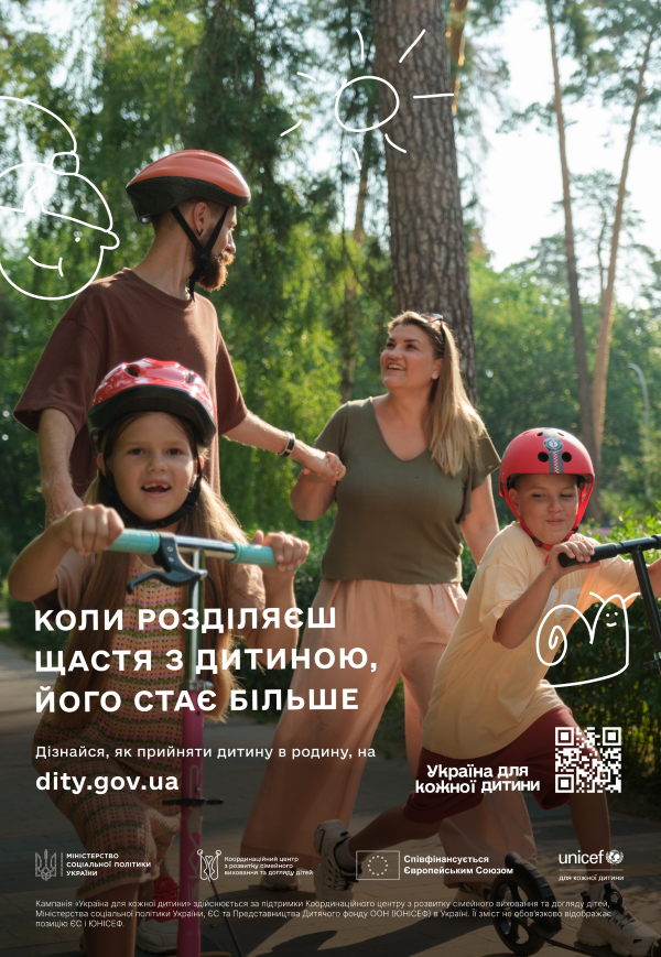 Кампанія «Україна для кожної дитини» здійснюється за підтримки Координаційного центру з розвитку сімейного виховання та догляду дітей, Міністерства соціальної політики України, ЄС та Представництва Дитячого фонду ООН (ЮНІСЕФ) в Україні. Її зміст не обов’язково відображає позицію ЄС і ЮНІСЕФ.