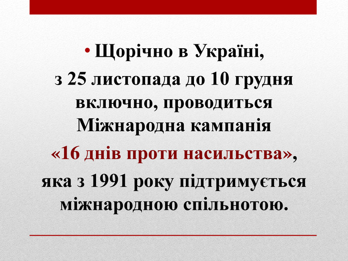 З 25 листопада по 10 грудня включно проводиться Всеукраїнська акція «16 днів проти насильства»