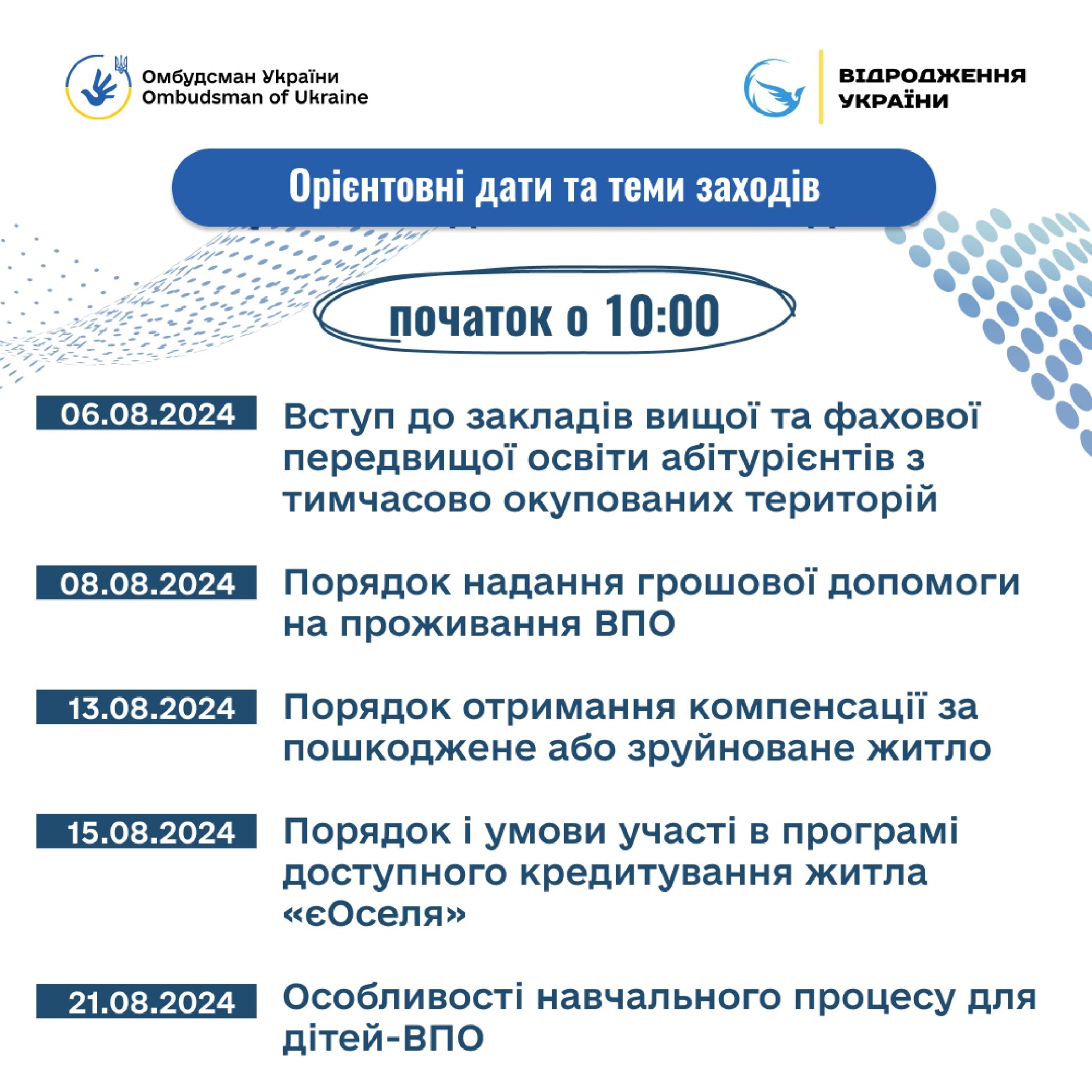 Запрошуємо внутрішньо переміщених осіб на онлайн заходи, де представники різних міністерств і Офісу Омбудсмана нададуть відповіді на всі питання які у вас виникають, починаючи від виплати допомоги на проживання, вступу дітей до закладів освіти, постановки на квартирний облік, закінчуючи компенсацією за пошкоджене або зруйноване майно.